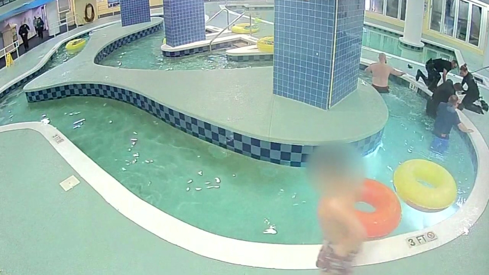 A video shows the boy and his friend swimming around the lazy river at a resort. They removed a metal grate on the floor.