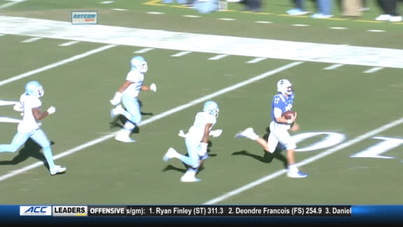 After taking a 35-28 lead into the break following a shootout of a first half, Duke pushed to a two-possession lead when Jones' 68-yarder set up a short TD run by Quentin Harris. The Tar Heels (1-8, 1-6) got back in it with Nathan Elliott's 13-yard TD throw to Thomas Jackson with 75 seconds left.