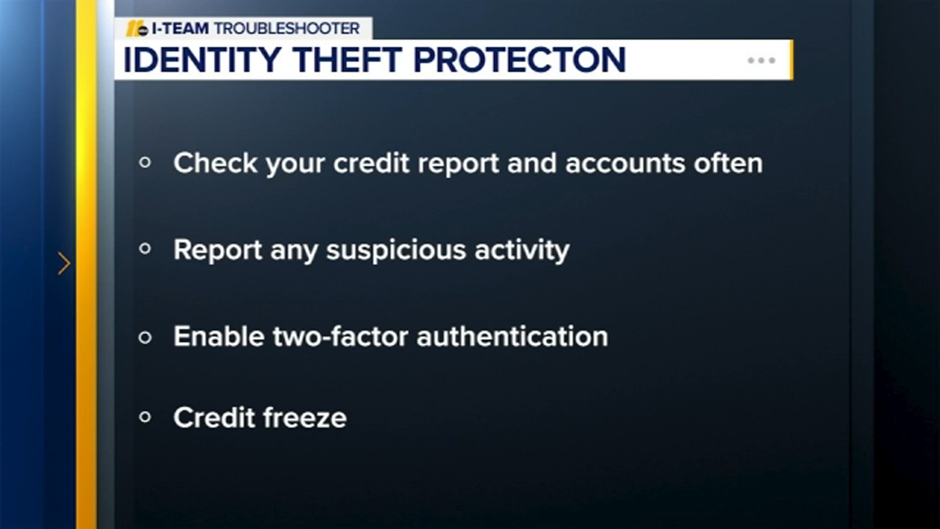 You should check your credit report and accounts often and report any suspicious activity. Make sure you enable two-factor authentication on your devices and accounts. Also, consider a credit freeze. If a scammer attempts to access your credit and open a fraudulent account, a credit freeze will block them. The downside for you is that during a credit freeze, you can't apply for a loan or open an account.