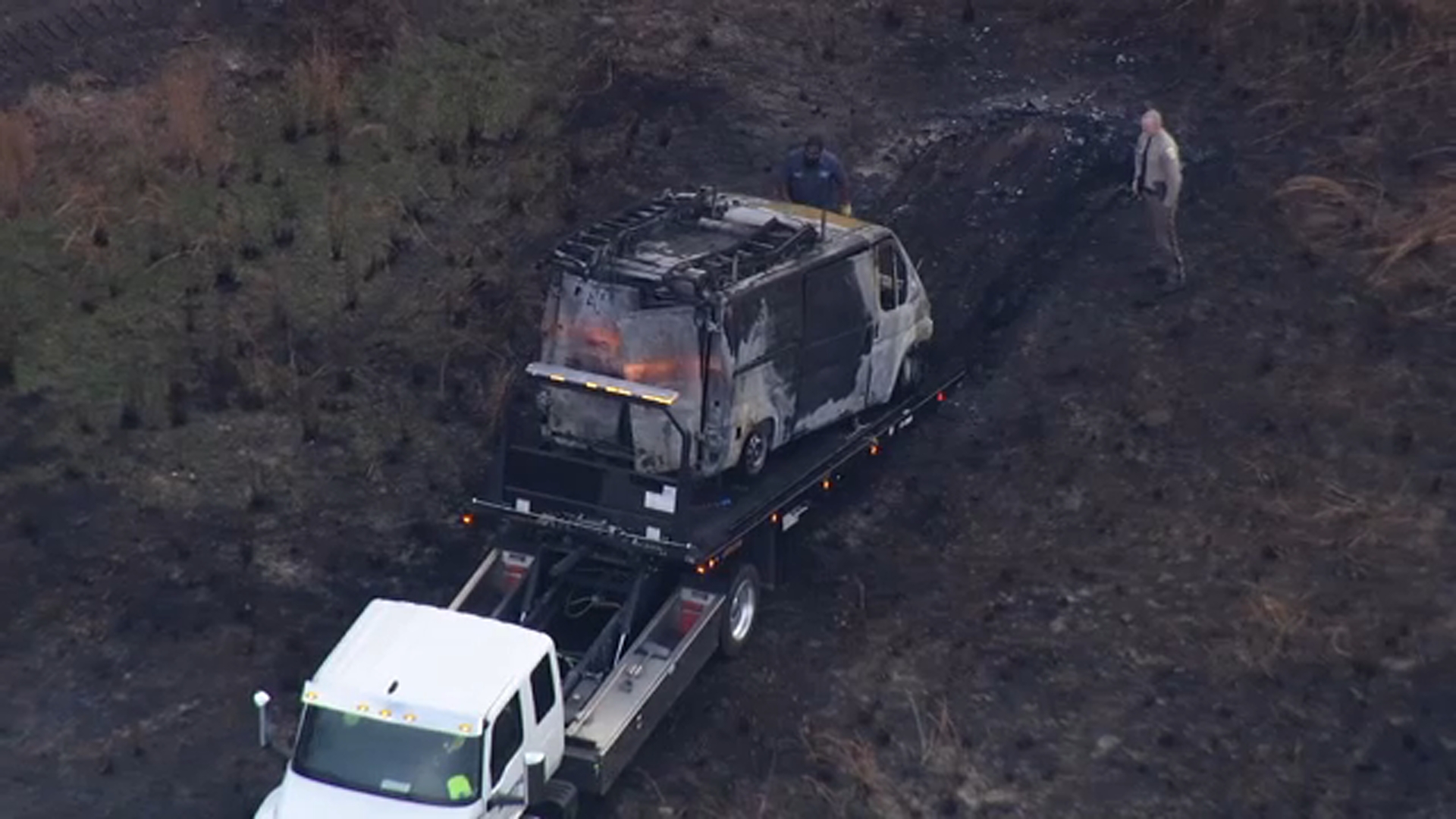 The heat from the van's engine caused the field to catch fire, which resulted in fire damage to a sheriff's office patrol car. The fire department was able to get the fires out but the cars appeared to be completely burned.