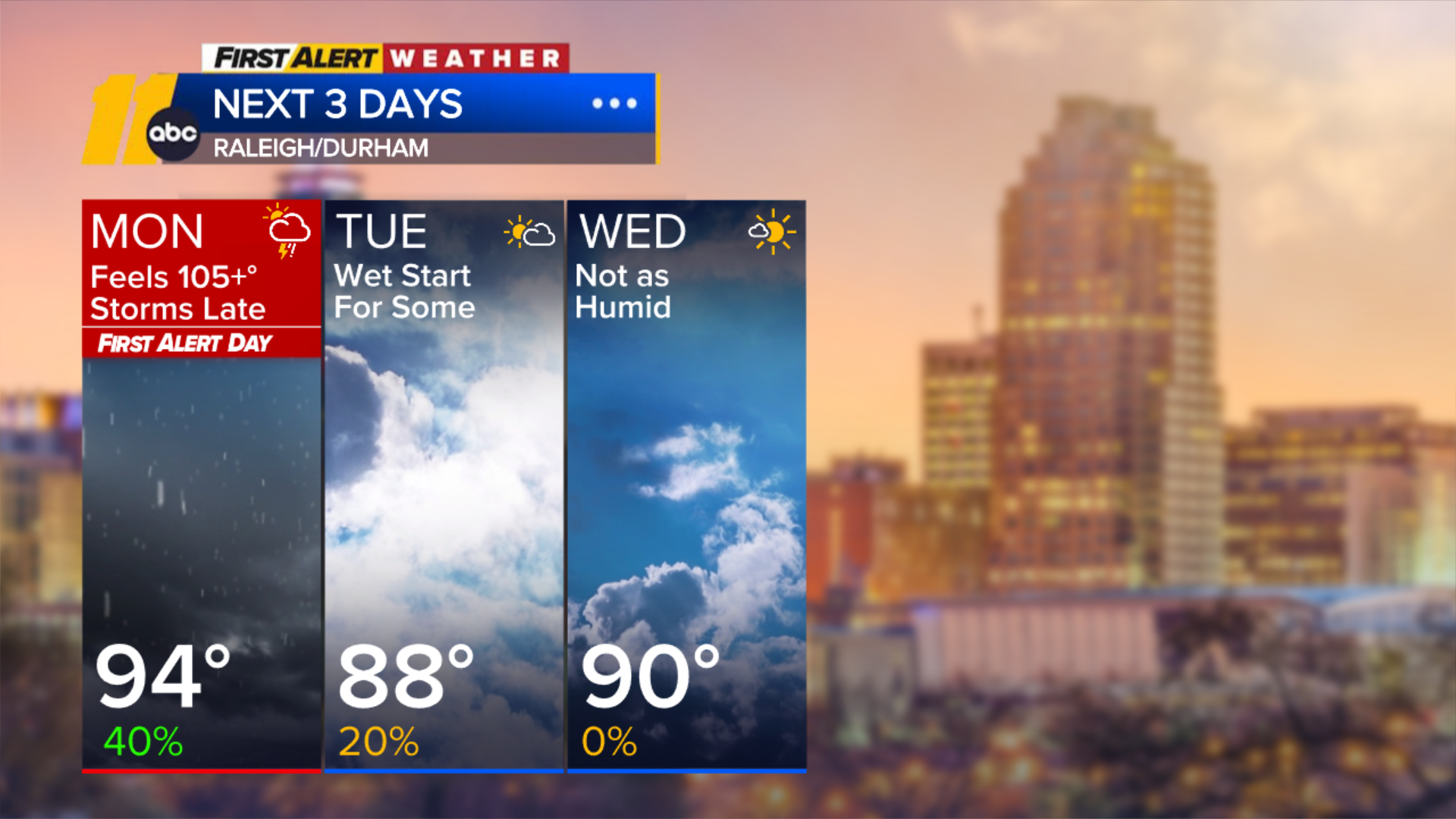 Tuesday will be cooler and less humid, with highs in the mid/upper 80s and a mix of clouds and sun. Areas south of the Triangle could start the day with a few showers, but drier weather returns for the afternoon.