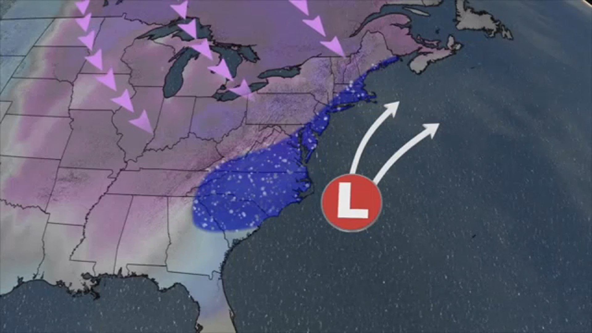 A few inches of snow is possible on the coasts of Delaware, Maryland and New Jersey, as well as New York's Long Island and Massachusetts' Cape Cod.
